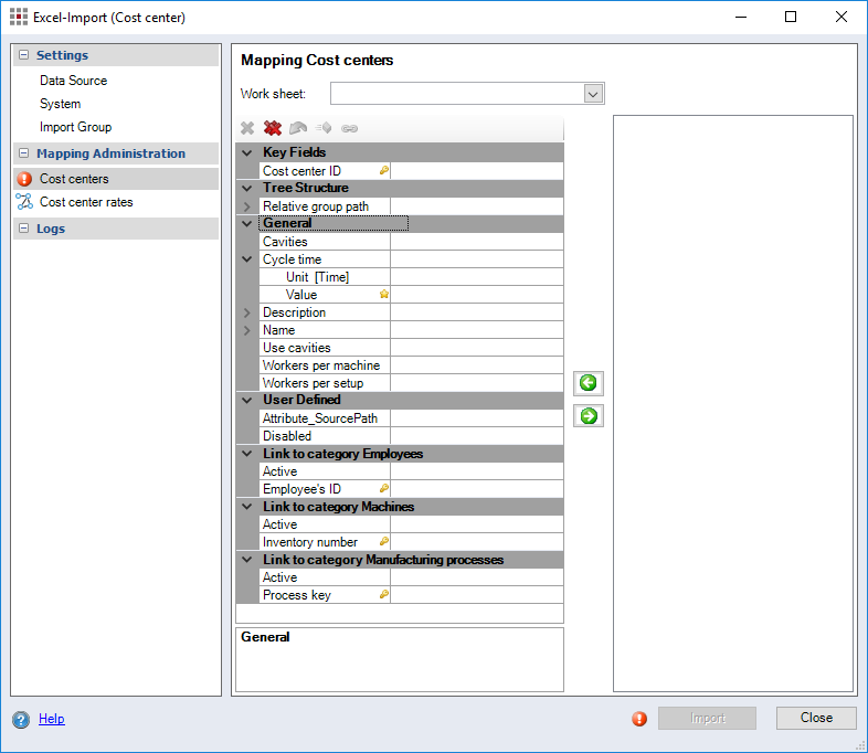 Figure: Excel Import (Cost Center) dialog, Mapping Cost Centers