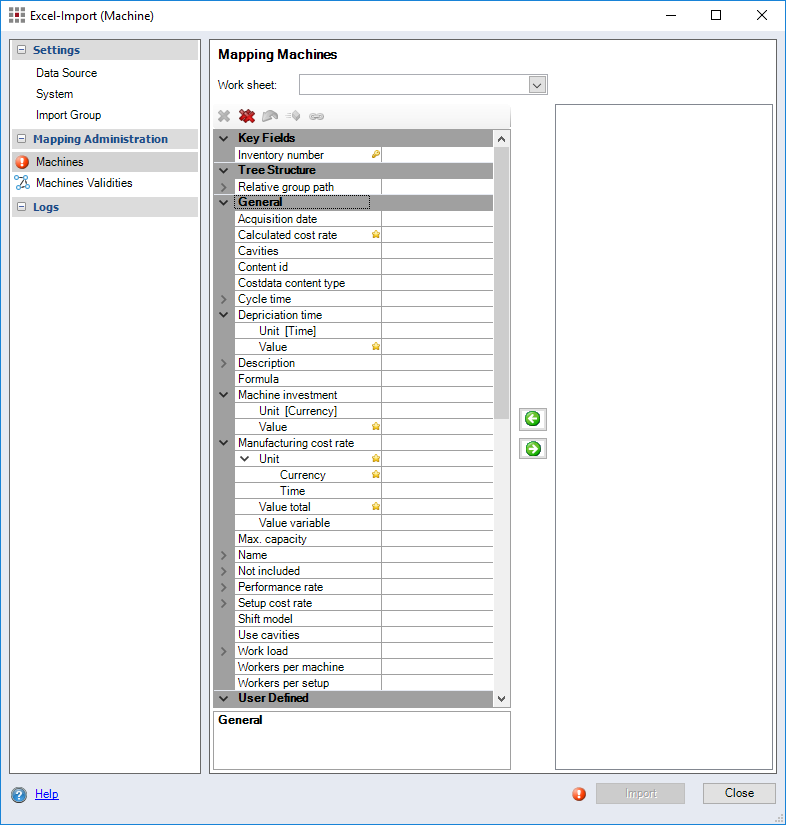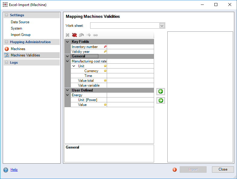 Figure: Excel Import (Machines) dialog, Mapping Machines Validities