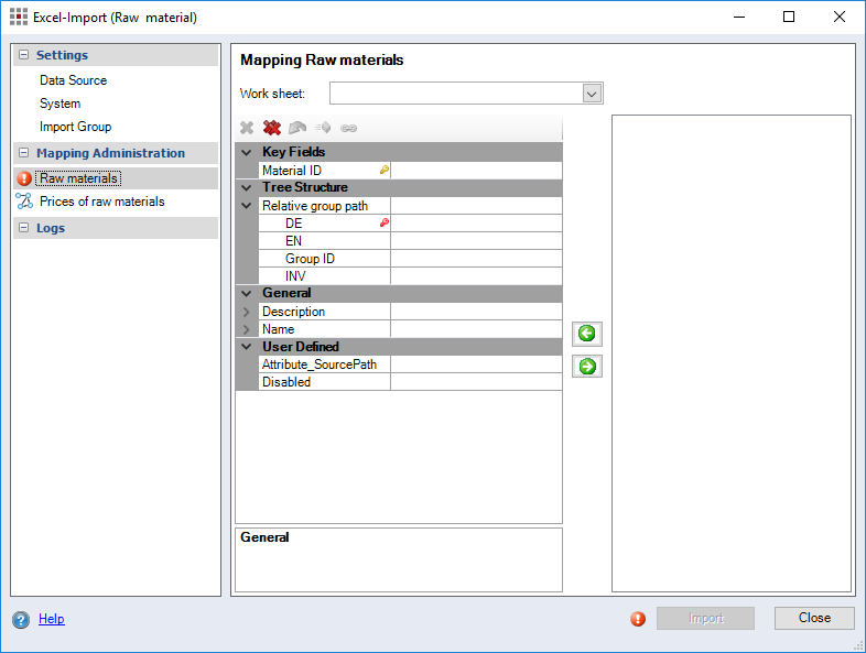 Figure: Excel Import (Raw Material) dialog, Mapping Prices of Raw Materials