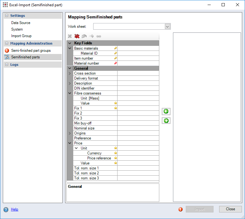 Figure: Excel Import (Semifinished Part) dialog, Mapping Semifinished Parts