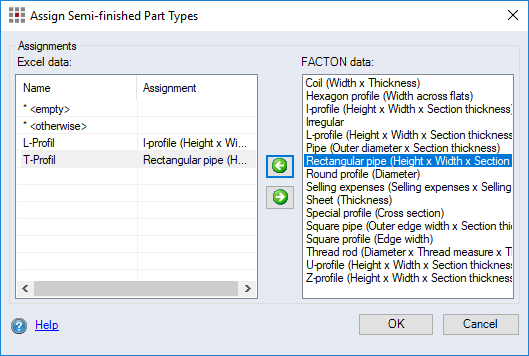 In order to assign a semifinished part to the correct form type during import, one column of the Excel workbook must first be assigned to the "Form type" field. The matching FACTON semifinished part form type must be assigned to each value that contains this column in the Excel workbook.