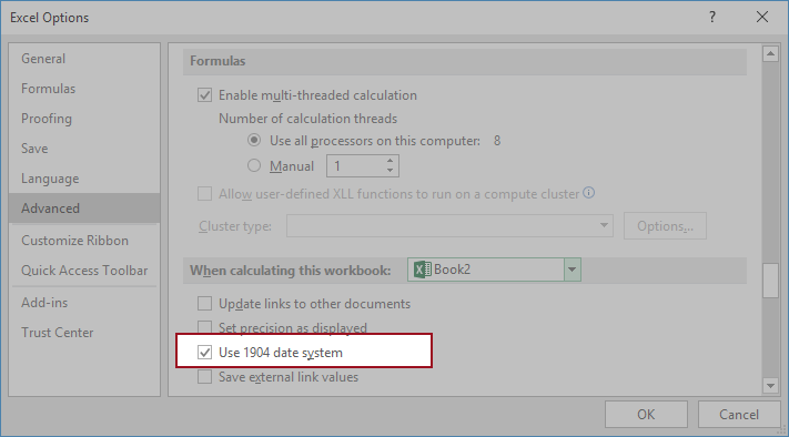 FACTON cannot correctly interpret dates if the Use 1904 date system box is checked in Excel files. In this case, date entries from imported Excel files will be interpreted incorrectly.