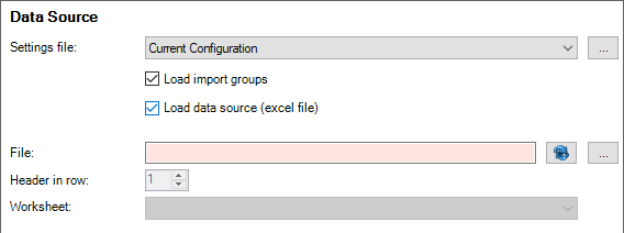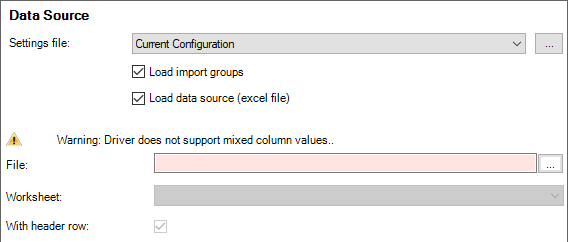 The "Data Source" group in the "Excel Import"dialog is displayed differently depending on the Excel data driver set.