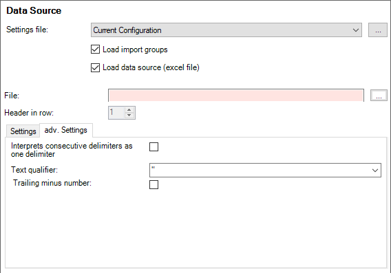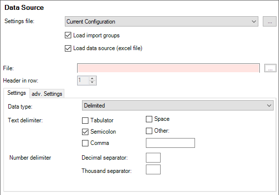:Click this button to select the Excel- or CSV-file for the import. The file path is shown next to the button.