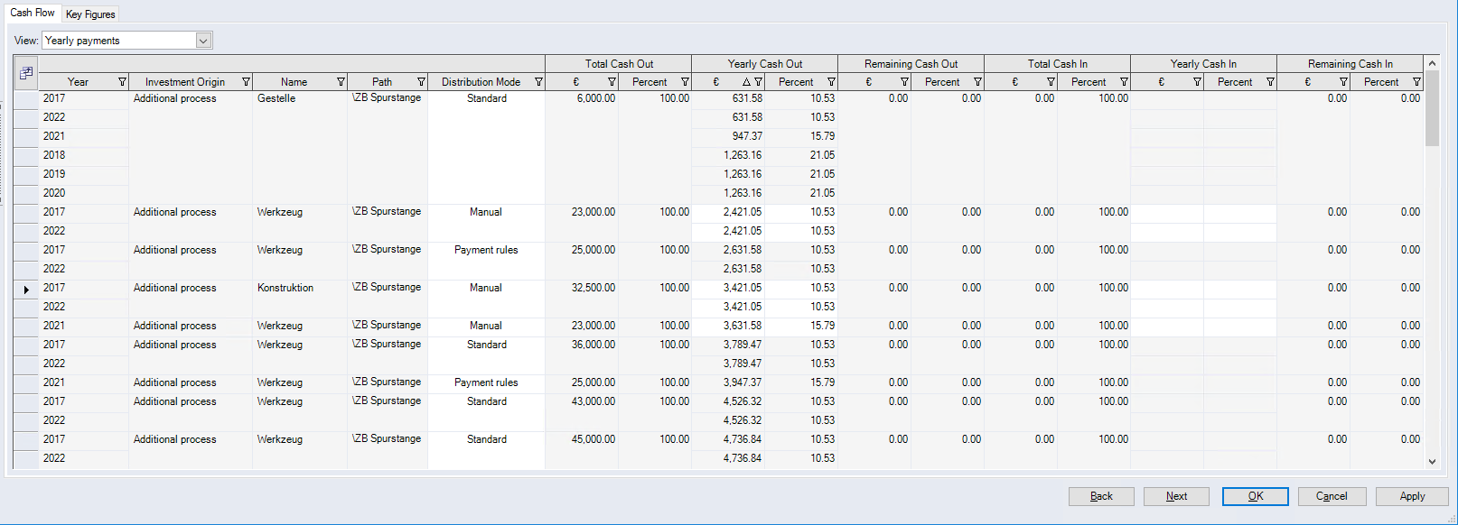 Selection of the cash flow course per investment origin The distribution mode determines how the cash flow is being distributed over the investment period/project period.