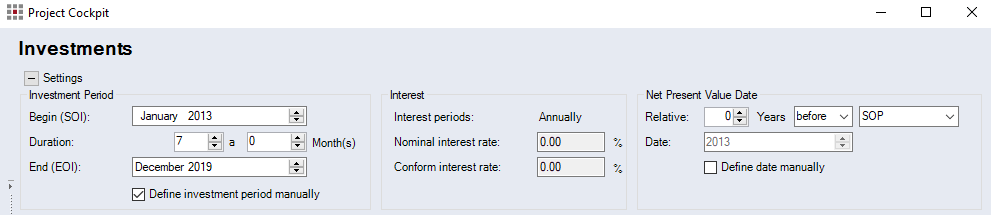 | "Define investment period manually" checkbox | The checkbox is only available, if the system settings allow you to overwrite the investment period manually. |