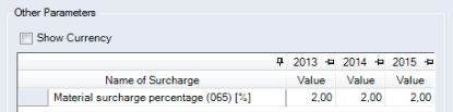 For the years 2013, 2014 and 2015, enter a percentage value for the basic data type "Material surcharge percentage".