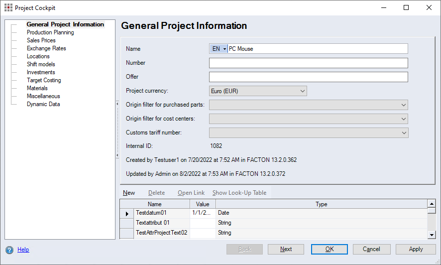 Production planning Here you can change time dependencies of the project (e.g. project start or planning horizon) and the quantities. Production Planning for a Project