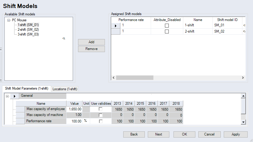 All shift models from Data Administration are listed here. When you select a shift model from the list, its data are displayed in the "Shift Model Parameters" group. The parameter data may differ depending on the location.