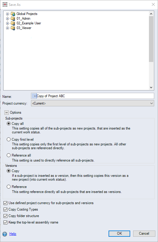 - Deactivated checkbox: Top-level assembly assumes the name of the new project.