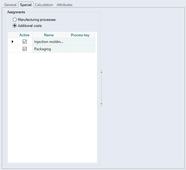 Multiple manufacturing processes can be added and multiple ones can be actively assigned. You cannot assign the same manufacturing process multiple times. If a cost model with assigned manufacturing process is inserted in a project, you can use the "Technology" calculation mode Here, the times for different activity types (machine, worker, setup) are calculated in the project. |