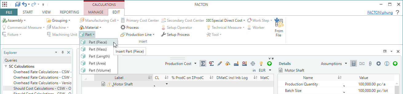 In the following, you will learn how to build calculation structure for "Motor Shaft". The calculation valuation must be set to "*Aggregate Costs". A part (piece) is then inserted as local calculation element. The estimation costs are entered for this part.