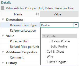 At the material, you can maintain value rules that are only valid for this material. Based on the selected values in the calculation for the dimensions, the dimension-dependent property of the value rule is determined.