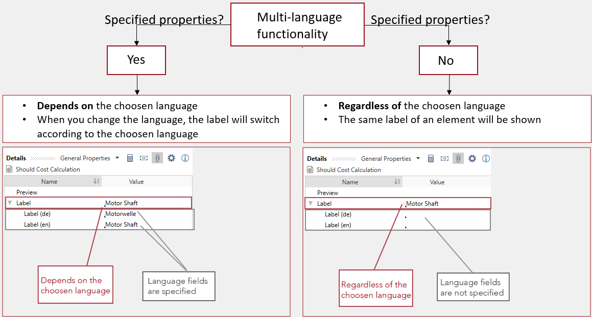 The multilingual functionality is available for all elements that contain the properties Label and Description. When you create or rename elements, you can decide for each element whether you want to enter the description in one or more languages.