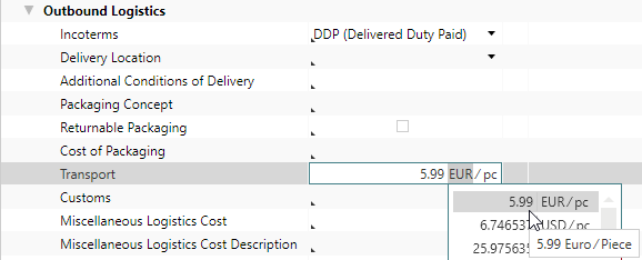 5.99 EUR / pc means that 5.99 "EUR" transport costs incur for 1 "Piece (pc)" should cost calculation.