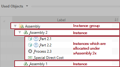 The Used Objects view shows all calculation elements that are used in the Structure view. Relevant properties and values of the calculation elements are displayed, which you can check and quickly edit in this view.
