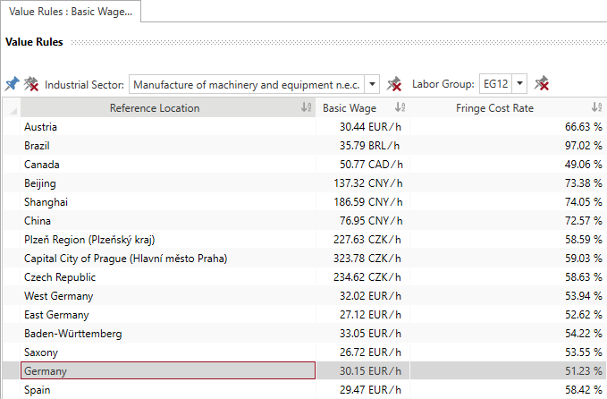 Only the value rules that contain the selected or fixed value are displayed. The value with the corresponding dependent dimension (column) is displayed above the value rule table. The corresponding column is no longer displayed in the value control table.